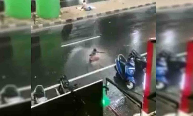 தொடர்ந்து அவர் சிறிது நேரம் அமர்ந்தபடி நடன ஆக்சன்களை செய்தபடி மழையில் நனைந்தபடி இருந்ததை,அங்கிருந்த ஒருவர் செல்போனில் பதிவு செய்து சமூக வலைதளங்களில் வெளியிட்டார். தற்போது அந்த காட்சிகள் வைரலாகி வருகிறது.