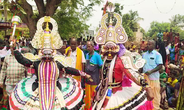 காலை கோவில் முன்பு அமைக்கப்பட்ட பிரமாண்ட துரியோதனன் சிலை முன்பு, பீமன், துரியோதனன் வேடமணிந்து நாடக நடிகர்கள் துரியோதனன் படுகளம் நிகழ்ச்சி நடத்தினர்.