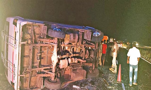 இந்த மேலூர் அருகே தும்பைப்பட்டி பகுதியில் நான்கு வழிச்சாலையில் இன்று அதிகாலை 3 மணி அளவில் சென்று கொண்டிருந்தது. அப்போது எதிர்பாராதவிதமாக வேன் டிரைவரின் கட்டுப்பாட்டை இழந்து தாறுமாறாக ஓடி சாலையோரத்தில் கவிழ்ந்தது.