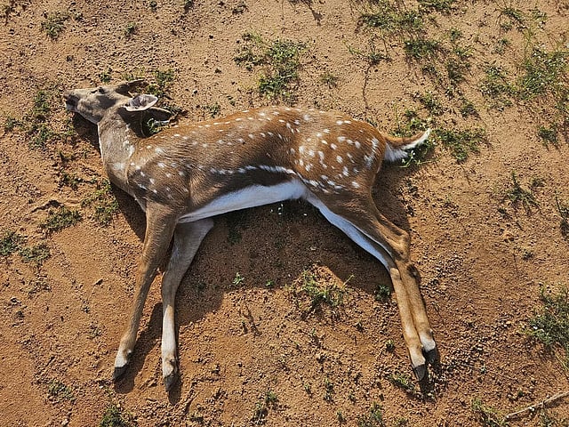 திருச்சி மணிகண்டம் அருகே உள்ள அளுந்தூர் கிராமத்திம் இந்திரா நகர் பகுதியில் புள்ளி மான் ஒன்று கம்பி வேலியில் மாட்டி இறந்துவிட்டது. இது குறித்து தகவல் அறிந்த சம்பவ இடத்திற்கு சென்ற மணிகண்டம் போலிசார் மான் இறந்து போன தகவலை வனத்துறையினருக்கு தெரிவித்தனர். அங்கு வந்த வனத்துறையினரிடம் இறந்து போன மானை ஒப்படைத்தனர். அளுந்தூர் கிராமத்திலிருந்து சுமார் 10 கிலோமீட்டர் தொலைவில் விராலிமலை இருப்பதால் அதனை ஒட்டியுள்ள வனப் பகுதியில் இருந்து வழி தவறி இந்த புள்ளிமான் வந்திருக்கலாம் என்று வனத்துறையினர் தெரிவித்தனர். புள்ளிமான் ஒன்று இறந்து கிடப்பது பார்த்தா அப்பகுதி மக்கள் பரிதாபத்துடன் ஆச்சரியத்துடனும் பார்த்து சென்றனர்.