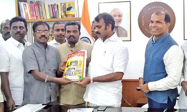 திருக்காட்டுப்பள்ளி அருகே உள்ள நேமம் கிராமத்தில் பெரும்பிடு குமுத்தரையர் காளாபிடாரி அம்மன் கோவிலில் அமைந்துள்ள அரையர் சுவரன்மாறன் பிடாரி அறக்கட்டளை சார்பில் அதன் பொறுப்பாளர் ஜோதி தலைமையில் பேராசி ரியர் சந்திரசேகரன் மற்றும் குழுவினர் மத்திய இணை அமைச்சர் எல்.முருகனை சந்தித்து மனு ஒன்றை கொடுத்தனர்.