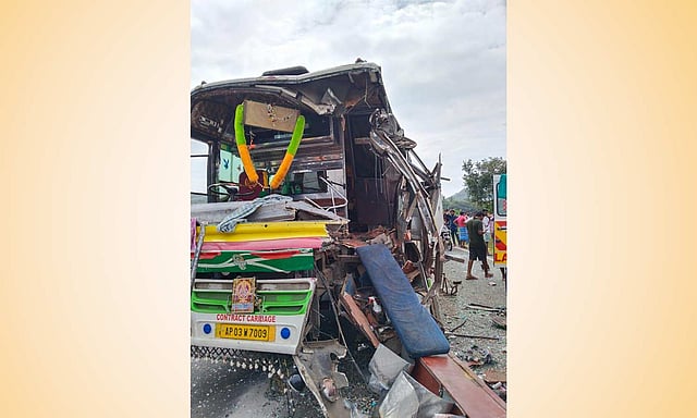 ஆந்திராவைச் சேர்ந்த அய்யப்ப பக்தர்கள் மினி வேனில் சபரிமலை சென்று விட்டு திரும்பி வந்து கொண்டிருந்தனர். இன்று அதிகாலை கணியம்பாடி அருகே உள்ள தனியார் பள்ளி அருகே வந்து கொண்டிருந்தபோது முன்னாள் வேலூர் நோக்கி சென்று கொண்டிருந்த அரசு பஸ் மீது வேன் மோதியது.