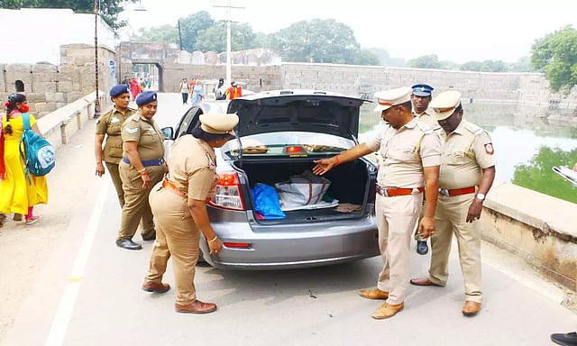 வேலூர் கோட்டையிலும் பலத்த பாதுகாப்பு போடப்பட்டிருந்தது. கோட்டைக்கு வந்த பயணிகளின் உடைமைகளை போலீசார் சோதனை செய்து உள்ளே அனுப்பினர்.