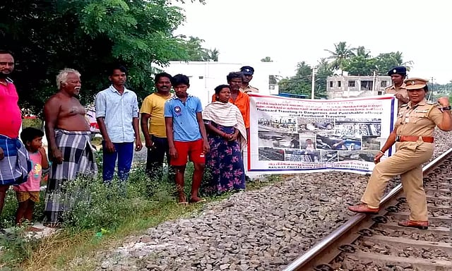 தண்டவாளத்தில் விளையாட்டு தனமாக குழந்தைகள் கற்களை வைப்பது குற்றம் என்பதை வலியுறுத்தி பொது மக்களுக்கு விழிப்புணர்வு ஏற்படுத்தினர்.
