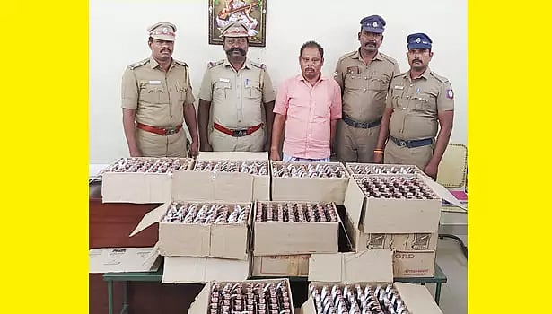 அப்போது அவர் சந்திரகிரி புரத்தைச் சேர்ந்த சிவசக்தி முருகன் (வயது 47) என்பதும், மதுபாட்டில்களை பதுக்கிவைத்து விற்பனை செய்து வந்தததும் தெரியவந்தது. இதையடுத்து அங்கிருந்த மது பாட்டில்கள் வைக்கப்பட்டிருந்த பெட்டிகளை பறிமுதல் செய்த போலீசார் முருகனை கைது செய்தனர்.