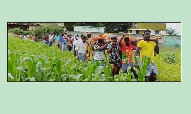 இதனால் 1 கிலோ மீட்டர் தொலைவில் உள்ள மயா னத்திற்கு தனியார் நிலங்கள் மற்றும் சிறு குறு, நீரோடை வழியாக இறந்தவர்களின் சடலங்களை கொண்டு சென்று வருகின்றனர். இந்நிலையில் தற்போது விவசாய நிலங்களில் சோளம் பயிரிட்டப்பட்டு உள்ளது.