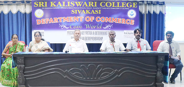 சிவகாசி காளீஸ்வரி கல்லூரி வணிகவியல் துறை சார்பில் ''விலை நிர்ணயம் என்பதே தொழில் முனைவோர் வெற்றியைத் தீர்மானிக்கும் காரணி'' என்ற தலைப்பில் கருத்தரங்கம் நடந்தது.
