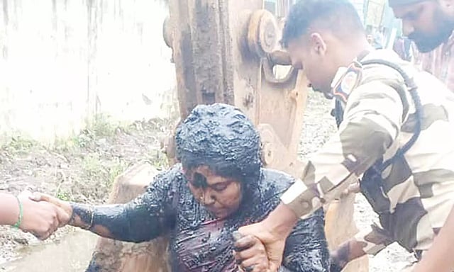 உடனடியாக அருகில் இருந்த போலீசாரிடம் இதுபற்றி தகவல் தெரிவித்தனர். சப் - இன்ஸ்பெக்டர் சண்முகம், போலீஸ்காரர் வினோத் ஆகியோர் விரைந்து சென்று கால்வாயை சுத்தம் செய்யும் பணியில் ஈடுபட்டிருந்த ஜே.சி.பி எந்திரத்தின் கால்வாயில் தத்தளித்துக் கொண்டிருந்த பெண்ணை பத்திரமாக மீட்டனர்.