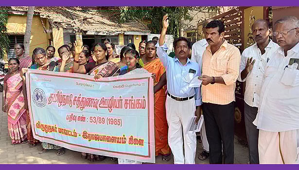 சத்துணவு ஊழியர்களை முழுநேர அரசு ஊழியர்களாக்கி வரையறுக்கப்பட்ட ஓய்வூதியம், குடும்ப ஓய்வூதியம் போன்றவைகளை வழங்க கோரியும், பழைய பென்ஷன் திட்டத்தை மீண்டும் அறிவிக்க கோரியும் உள்பட தேர்தல் கால வாக்குறுதிகளை நிறைவேற்றக் கோரி விருதுநகர் மாவட்டம் ராஜபாளையம் ஊராட்சி ஒன்றிய அலுவலகம் முன்பு தமிழ்நாடு சத்துணவு ஊழியர் சங்கத்தினர் ஆர்ப்பாட்டம் நடத்தினர்.
