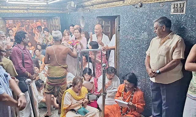 ஜப்பான் நாட்டு குழுவினருக்கு கோவில் நிர்வாகம் சார்பில் மாலை மரியாதை செய்யப்பட்டது.