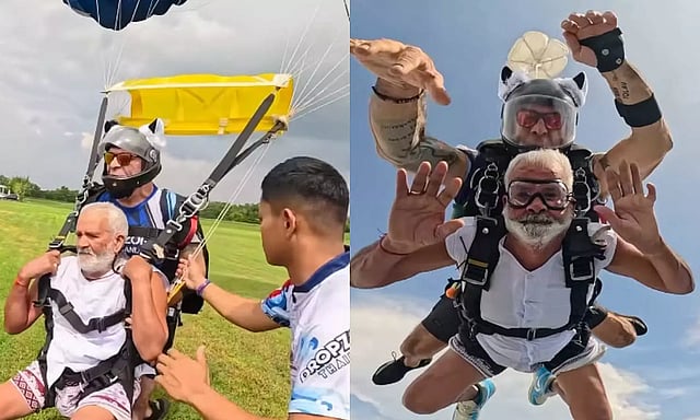 அரியானாவைச் சேர்ந்த சுஹாத் சிங் என்ற 80 வயது முதியவர்ஸ்கை டைவிங் செய்த வீடியோ இணையத்தில் வைரலாகியது.