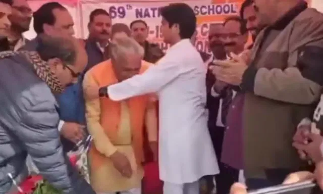 தன்னைவிட 41 வயது இளையவரின் காலில் விழுந்து வணங்க முயன்ற தேவேந்திர குமாரின் இந்தச் செயல் விவாதத்தை ஏற்படுத்தி உள்ளது.