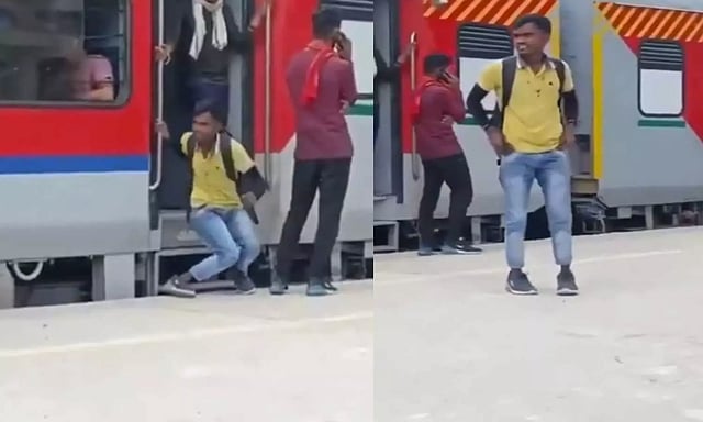 இணையத்தில் வைரலாக பரவி வரும் அந்த வீடியோவில், ரெயில் நிலையத்தில் மாற்றுத்திறனாளி போல ரெயிலில் இருந்து கீழே இறங்கி வரும் நபர் ஒருவர் பின்பு சாதாரணமாக நடந்து செல்கிறார்.