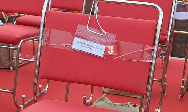 இந்த நிகழ்ச்சிக்கு வந்திருக்கும் முக்கிய விருந்தாளிகளுக்கு வழக்கம் போல் முன் வரிசையில் அமர இருக்கைகள் ஒதுக்கப்பட்டு இருந்தது. இதில் எதிர்கட்சியான காங்கிரஸ் கட்சி தலைவர் மல்லிகார்ஜுன கார்கேவிற்கும் இருக்கை ஒதுக்கப்பட்டது.