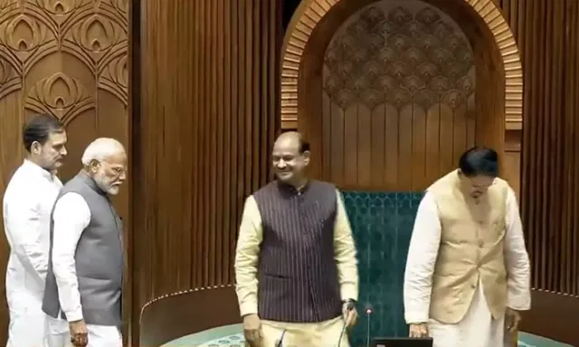 ஓம்பிர்லாவை பிரதமர் மோடியும், எதிர்க்கட்சி தலைவர் ராகுல்காந்தியும் பாரம்பரிய முறைபடி அவரது இருக்கைக்கு அழைத்துச் சென்றனர். அங்கு அமர்ந்திருந்த தற்காலிக சபாநாயகர் மகதாப் எழுந்து நின்று வணங்கி ஓம்பிர்லாவை வரவேற்று கை குலுக்கினார்.
