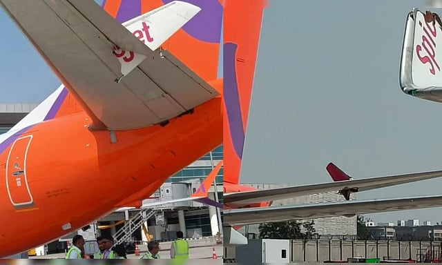 நகர்ந்து சென்ற ஸ்பைஸ்ஜெட் விமானத்தின் வலது சிறகு, நின்று கொண்டிருந்த ஆகாசா ஏர் விமானத்தின் வால் பகுதியில் பலமாக மோதியது. இதில் இரண்டு விமானங்களின் பாகங்களும் சேதமடைந்தன.