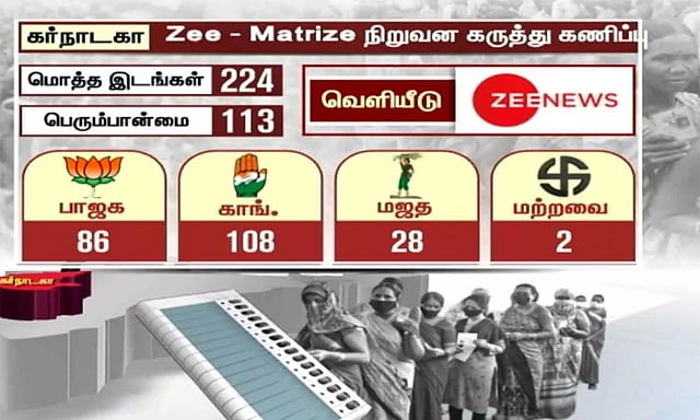 ஜீ மேட்ரைஸ் கருத்துக்கணிப்பில் பாஜகவை விட காங்கிரஸ் முந்தியது. காங்கிரஸ் 108 தொகுதிகள், பாஜக 86 தொகுதிகள், மதச்சார்பற்ற ஜனதா தளம் 28 தொகுதிகளை பிடிக்க வாய்ப்பு உள்ளதாக தெரியவந்துள்ளது.