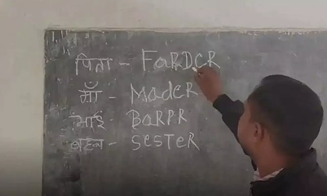 சத்தீஸ்கர் மாநிலத்தை சேர்ந்த ஆசிரியரான கமலேஷ் பாண்டே தொடக்கப் பள்ளியில் ஆங்கில வகுப்பை எடுக்கிறார். அப்போது, Friday-க்கு பதில் FarDay, என்றும் Saturday-க்கு பதில் Saterday என்றும் பலகையில் எழுதுகிறார். Father, Mother, Brother, Sister என்று குடும்ப உறுப்பினர் சொற்களுக்கு முறையே Farder, Mader, Barpr, Sester என்றும், அதேபோல் Nose, Ear, Eye-க்கு பதில் Noge, eare, iey என்று கரும்பலகையில் எழுதி மாணவர்களையும் சொல்லச் சொல்லி நோட்டில் எழுதிக்கொள்கின்றனர்.