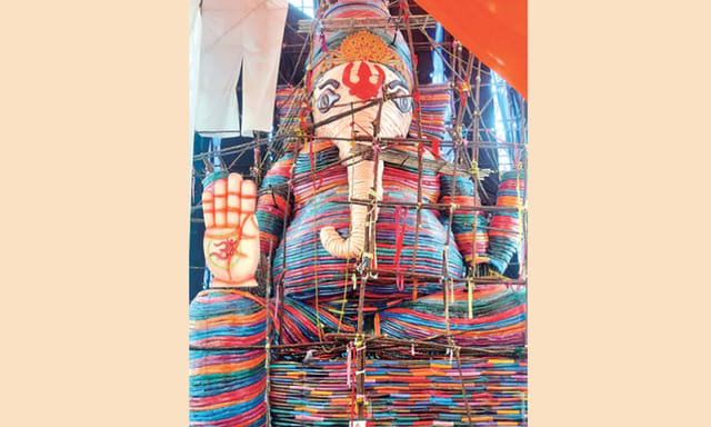 சேலைகளை ஒன்றின் மீது ஒன்றாக அடுக்கி விநாயகர் சிலையை தயார் செய்துள்ளனர். விநாயகர் சிலை தயார் செய்யும் கலைஞர்கள் பெரும்பாலான வேலைகளை முடித்து விட்டனர்.