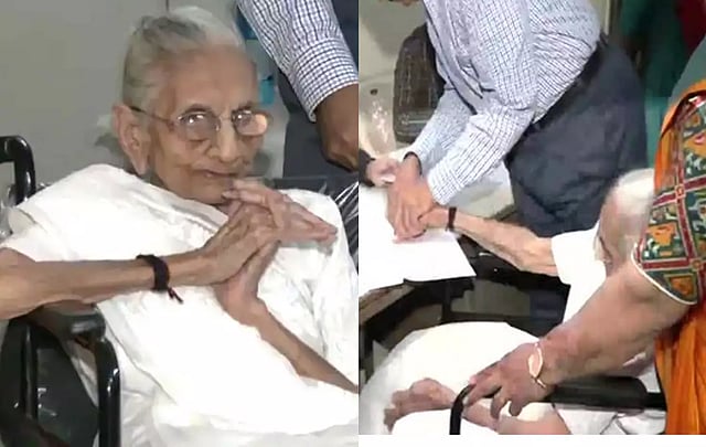 குஜராத்தில் சட்டப்பேரவைத் தேர்தலுக்கான இரண்டாம் கட்ட வாக்குப்பதிவு இன்று நடைபெற்று வருகிறது. இதில் காந்திநகர் அருகே ரேசன் கிராமத்தில் உள்ள வாக்குச் சாவடிக்கு, பிரதமர் மோடியின் தாயார் ஹீராபென் மோடி, சக்கர நாற்காலியில் அமர்ந்தவாறு தனது இளைய மகன் பங்கஜ் மோடியுடன் வருகை தந்தார். பிற குடும்ப உறுப்பினர்களின் உதவியுடன் தமது வாக்கை அவர் பதிவு செய்தார்.