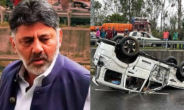 கர்நாடக துணை முதல்வர் டி.கே. சிவகுமாரின் கான்வாய் வாகனம் கவிழ்ந்து விபத்துக்குள்ளானதில் அதில் பயணித்த பணியாளர்கள் ஐந்து பேர் காயமடைந்தனர். ஓட்டுநர் மயிரிழையில் உயிர் தப்பினார்.