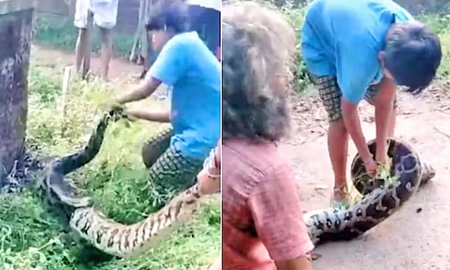 பாம்பை கண்டால் படையும் நடுங்கும் என கூறுவார்கள். ஆனால் 12 அடி நீள மலைப்பாம்பை 10 வயது சிறுவன் துணிச்சலாக பிடித்த வீடியோ இணையத்தில் வைரலாகி வருகிறது.