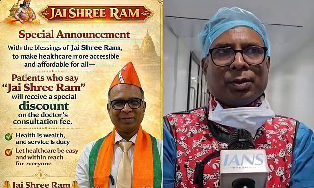 பிரபல இன்டர்வென்ஷனல் கார்டியாலஜிஸ்ட் டாக்டர் பி.கே. ஹஸ்ரா ' ஜெய் ஸ்ரீ ராம்' கியூ ஆர் குறியீடு உடன் வெளியிட்டுள்ள போஸ்டரில், பாலிகஞ்ச் ஃபடியில் உள்ள தனது கிளினிக்கில் 'ஜெய் ஸ்ரீ ராம்' என்று கோஷமிடும் நோயாளிகளுக்கு மருத்துவர் ஆலோசனைக் கட்டணத்தில் ரூ.500 தள்ளுபடி வழங்கப்படும் என்று குறிப்பிட்டுள்ளார்.