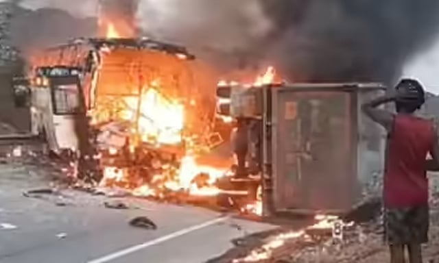 லாரியில் மோதியதும் மளமளவென்று பேருந்து தீப்பற்றி எரிந்தது.
