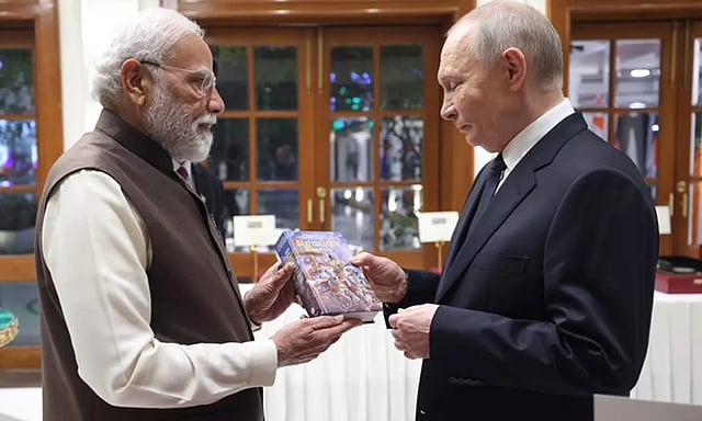 இந்தியாவுக்கு வந்துள்ள ரஷிய அதிபர் புதினுக்கு பிரதமர் மோடி, ரஷிய மொழியில் மொழி பெயர்க்கப்பட்ட பகவத் கீதையை பரிசாக வழங்கினார்.