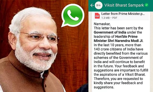 'விக்சித் பாரத் சம்பார்க்' என்ற பெயரில் அனுப்பப்பட்டுள்ள அந்த வாட்ஸ் அப் செய்தியில், அரசாங்க திட்டங்கள் மற்றும் கொள்கைகள் குறித்து பொதுமக்களிடம் இருந்து கருத்துக்களையும் பரிந்துரைகளையும் கேட்பதாக குறிப்பிடப்பட்டுள்ளது. அதனுடன் பிரதமர் நரேந்திர மோடியின் கடிதம் ஒன்றும் இணைக்கப்பட்டுள்ளது. அதில் பிரதான் மந்திரி ஆவாஸ் யோஜனா, ஆயுஷ்மான் பாரத் போன்ற பல திட்டங்கள் குறித்து பொதுமக்களிடம் இருந்து கருத்துக்களை கேட்பதாக தெரிவித்துள்ளது