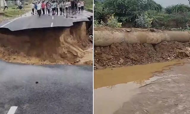 ராஜஸ்தான் மாநிலத்தில் திறப்பு விழாவிற்கு தயாராக இருந்த நெடுஞ்சாலை மழை வெள்ளத்தில் அடித்துசெல்லட்டதால் பொதுமக்கள் அதிர்ச்சி அடைந்தனர்.