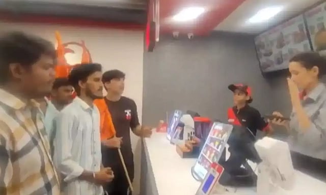 உத்தரப் பிரதேச மாநிலம் காசியபாத்தில் இந்திராபுரம் பகுதியில் KFC உணவக கிளை இயங்கி வந்தத. இந்நிலையில் நேற்று இந்த கடைக்குள் திடீரென காவிக்கொடியுடன் இந்து ரக்ஷா தளம் கும்பல் புகுந்தது.