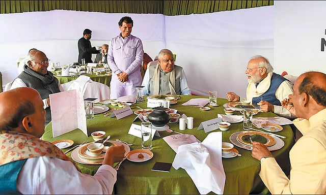 இந்த விருந்தில் துணை ஜனாதிபதியும், மாநிலங்களவை தலைவருமான ஜெகதீப் தன்கர், பிரதமர் மோடி, மக்களவை சபாநாயகர் ஓம் பிர்லா, ராணுவ மந்திரி ராஜ்நாத் சிங், காங்கிரஸ் தலைவர் கார்கே உள்ளிட்ட தலைவர்கள் ஒன்றாக அமர்ந்து சிரித்துப்பேசியவாறு நவதானிய உணவுகளை விரும்பி ருசித்து சாப்பிட்டனர்.