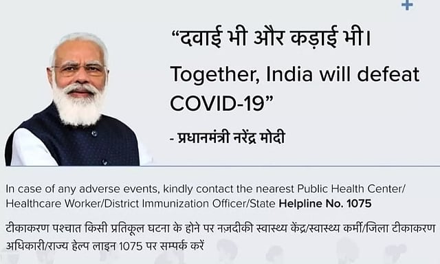 கொரோனா தடுப்பூசி செலுத்தியதற்கான கோவின் சான்றிதழை மக்கள் ஆன்லைனில் பதிவிறக்கம் செய்துகொள்ள ஏற்பாடு செய்யப்பட்டது. இந்தச் சான்றிதழில் பிரதமர் நரேந்திர மோடியின் புகைப்படம் இடம்பெற்றிருந்தது.