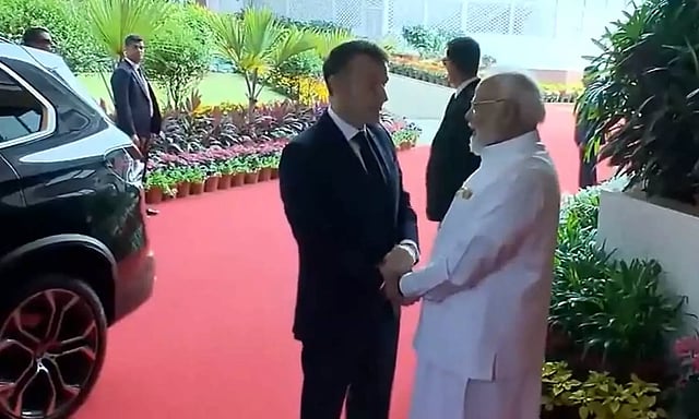 இதற்காக டெல்லியில் இருந்து பிரதமர் மோடி மும்பை சென்றார். பின்னர், லோக் பவனில் மேக்ரானை வரவேற்றார். அவரை கைக்கலுக்கி கட்டிப்பிடித்து பிரதமர் மோடி வரவேற்றார்.