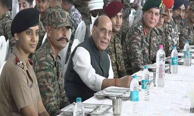 நிகழ்ச்சிக்கு பிறகு ராணுவ வீரர்கள் நடத்திய இரவு விருந்திலும் கலந்துகொண்டு அவர்களுடன் ஒன்றாக அமர்ந்து மத்திய மந்திரி ராஜ்நாத் சிங் உணவு சாப்பிட்டார்.