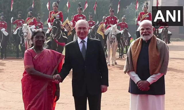 அங்கு, ஜனாதிபதி திரவுபதி முர்மு மற்றும் பிரதமர் மோடி ஆகியோர் கைகலுக்கு வரவேற்பு அளித்தனர். பின்னர், புதினுக்கு ராஷ்டிரபதி பவனில் அணிவகுப்பு மரியாதை நடைபெற்றது. அதை புதின் ஏற்றுக்கொண்டார்.
