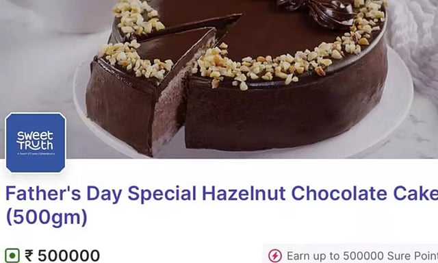 ஆனால் தற்போது சமூக வலைத்தளங்களில் வைரலாகும் ஒரு கேக்கின் ஸ்கிரீன்ஷாட் பயனர்களிடையே பேசு பொருளாக மாறியுள்ளது. அதாவது, "தந்தையர் தின சிறப்பு ஹேசல்நட் சாக்லேட் கேக்" என்று பட்டியலிடப்பட்டுள்ள இந்த பொருளின் விலை ரூ. 5 லட்சம். இது எழுத்துப்பிழை அல்லது தொழில்நுட்பக் கோளாறால் ஏற்பட்டிருக்கலாம். இருப்பினும் இந்த விலை குறித்து பயனர்கள் நகைச்சுவையாக பதிவிட்டு வருகின்றனர்.