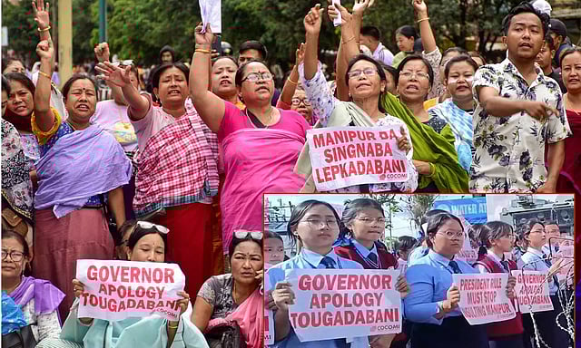 மேலும், கவர்னர் மன்னிப்பு கேட்க வேண்டும் என வலியுறுத்தினர். அத்துடன், டெல்லி சென்றுள்ள கவர்னர் இம்பால் திரும்பி ராஜ் பவனுக்கு செல்லும் வழியில் போராட்ட பேரணி நடத்தவும், சாலைகளின் இருபுறமும் மனித சங்கிலி போராட்டம் நடத்தவும் முடிவு செய்தனர்.