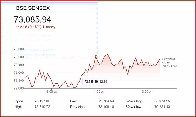 இன்று அதிகபட்சமாக 73,649.72 புள்ளிகள் வரை உயர்ந்து வர்த்தகம் ஆனது. பின்னர் சரிவதும், ஏறுவதுமாக இருந்தது. குறைந்தபட்சமாக 72,784.54 புள்ளிகளில் வர்த்தகமாகி இறுதியில் 112.16 புள்ளிகள் சரிவடைந்து 73,085 புள்ளிகளில் வர்த்தகம் நிறைவடைந்தது.