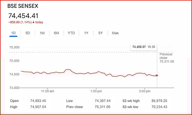 மும்பை பங்குச் சந்தை வர்த்தகம் நேற்று சென்செக்ஸ் 75,311.06 புள்ளிகளுடன் நிறைவடைந்தது. இன்று காலை வர்த்தகம் சென்செக்ஸ் 567.62 புள்ளிகள் சரிந்து 74,893.45 புள்ளிகளுடன் தொடங்கியது. அதன்பின் சற்று ஏறுவதும் இறங்குவதுமாக இருந்தது. இறுதியாக 856.66 புள்ளிகள் சரிந்து 74,454.41 புள்ளிகளில் வர்த்தகம் நிறைவடைந்தது.