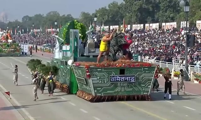 77வது குடியரசு தினத்தையொட்டி டெல்லி கடமைப்பாதையில் நடைபெறும் விழாவில் தமிழக அரசின் வாகனம் அணிவகுத்தது.