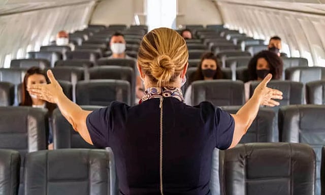 பயணிகள் மத்தியில் தோன்றி விமான பணிப்பெண்கள் விமானத்தில் பாதுகாப்பாக பயணிப்பது எப்படி என்று பாதுகாப்பு ஒத்திகைகளை செய்கைகள் மூலம் செய்து காட்டி கொண்டிருந்தார்.
