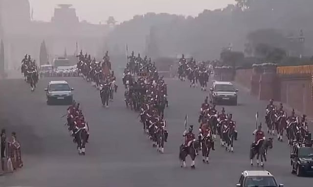 தேச பற்று பாடல்கள் இசைத்தப்படி பிரமாண்டமாக அணிவகுப்பு நடந்தது. இதனை காண, ஏராளமான மக்கள் விஜய் சவுக் பகுதிக்கு வருகை தந்தனர். வசுதேவ குடும்பகம் வடிப்பில் இந்த அணி வகுப்பானது நடைபெற்றது.
