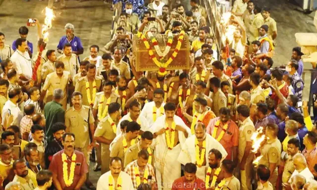 சபரிமலை கோவிலை போன்று பிரத்யேகமாக வடிவமைக்கப்பட்ட தேருக்கு தங்க ஆபரணங்கள் வந்ததும் ஊர்வலமாக தேர் புறப்பட்டது. அப்போது ஏராளமான பக்தர்கள் தங்க அங்கியை வழிபட்டனர்.