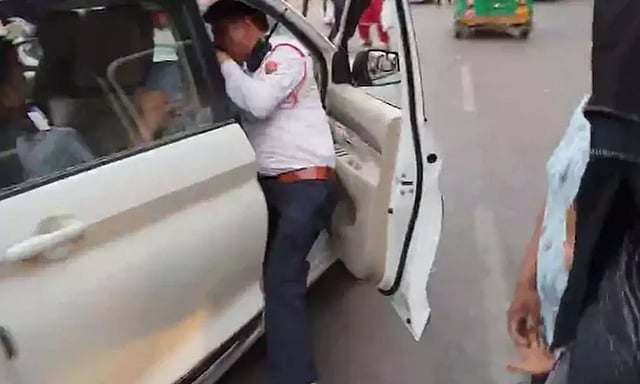 அப்போது திடீரென டிரைவர் காரை இயக்கியதால், போக்குவரத்து போலீஸ் காரின் கதவில் தொங்கிய படியே சில மீட்டர் தூரத்துக்கு இழுத்து செல்லப்பட்டார். இதைக்கண்ட மற்ற வாகன ஓட்டிகள், பொதுமக்கள் மற்றும் போக்குவரத்து போலீசார் காரை மடக்கிப் பிடித்தனர். இதுதொடர்பான காட்சிகள் அடங்கிய வீடியோ சமூக வலைத்தளங்களில் வைரலானது.