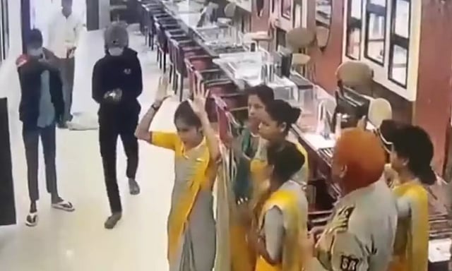 நகைக்கடை இன்று வழக்கம்போல் காலை கடை திறக்கப்பட்டு வியாபாரம் நடந்துகொண்டிருந்தபோது, திடீரென 6க்கும் மேற்பட்ட கொள்ளையர்கள் கையில் துப்பாக்கியுடன் உள்ளே புகுந்தனர்.