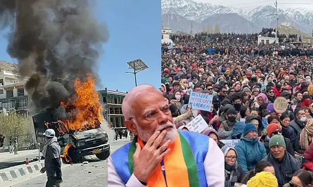 கடந்த புதன்கிழமை லடாக் தலைநகர் லே-வில் முழு அடைப்பு போராட்டம் நடைபெற்றது. அப்போது லடாக் இளைஞர்கள் நடத்திய போராட்டத்தில் அவர்களுக்கும் போலீசாருக்கும் இடையே தள்ளுமுள்ளு ஏற்பட்டது. இதனால் ஆத்திரமடைந்த போராட்டககாரர்கள் வன்முறையில் ஈடுபட்டனர். போலீசாரின் வாகனங்களுக்கு தீவைத்தனர்.