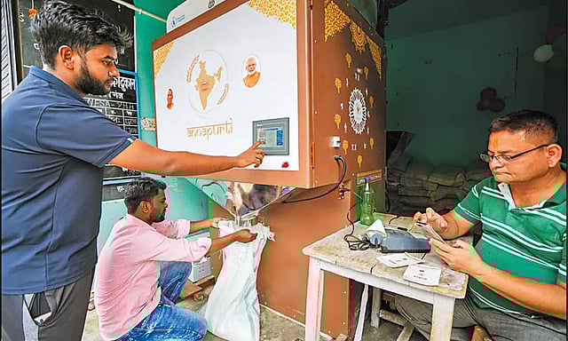 ரேஷன் கடைகளில் மக்கள் நீண்ட வரிசையில் காத்திருந்து உணவு பொருட்கள் வாங்கி வருகின்றனர். இந்த சிக்கலுக்கு தீர்வு காணும் வகையில் நாட்டின் சில மாநிலங்களில் தானியங்கி எந்திரங்கள் நிறுவப்பட்டு உள்ளன.அதாவது, பணம் எடுக்கும் ஏ.டி.எம். போல, ரேஷன் வழங்குவதற்காக தானிய ஏ.டி.எம். எந்திரங்கள் நிறுவப்பட்டு உள்ளன.