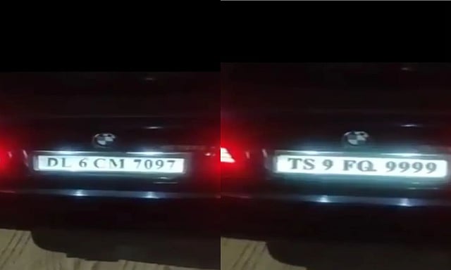 காரில் டெல்லி மற்றும் தெலங்கானா ஆகிய இரண்டு மாநிலங்களின் பதிவு எண்கள் கொண்ட பலகைகள் உள்ளன.